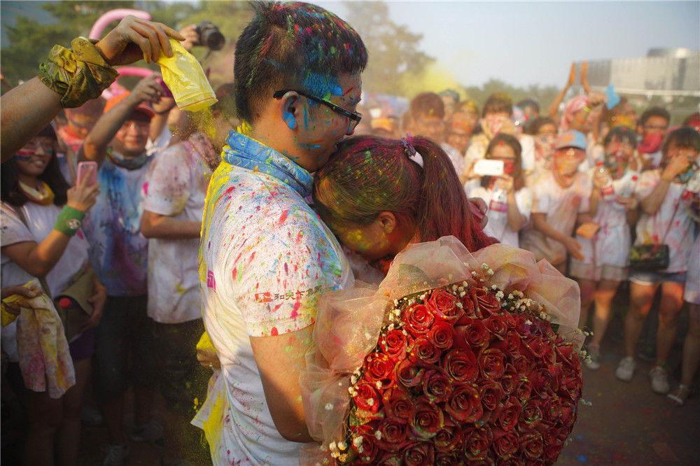2014年11月1日下午,广东惠州,彩跑者们回到终点站举起了事先准备好的牌子,男子跪地求婚成功,女孩子感动落泪。陈伟斌/视觉中国
