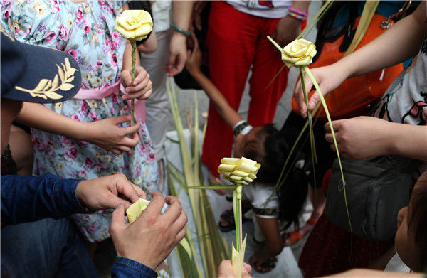 2014年8月2日,浙江省杭州市,编制绿玫瑰的师傅被大家围了个严严实实。这种绿色玫瑰是用棕榈叶编制而成,颇受大家的喜爱。