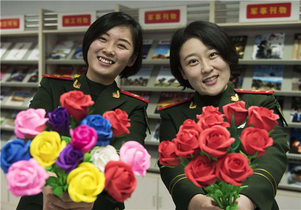 2019年2月19日,合肥,武警合肥支队两名女兵在展示面塑作品“玫瑰花”。视觉中国