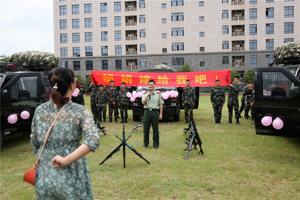 2018年8月17日,广西南宁,求婚仪式现场。一场求婚仪式在武警南宁支队军营中上演,在战友们的欢呼鼓励下,供应保障中队上士胡彪手捧鲜花向来队探望的女友朱明娟深情表白。在战友们的见证下,朱明娟接受了胡彪的求婚,两人许下相伴一生的诺言。李世近/视觉中国