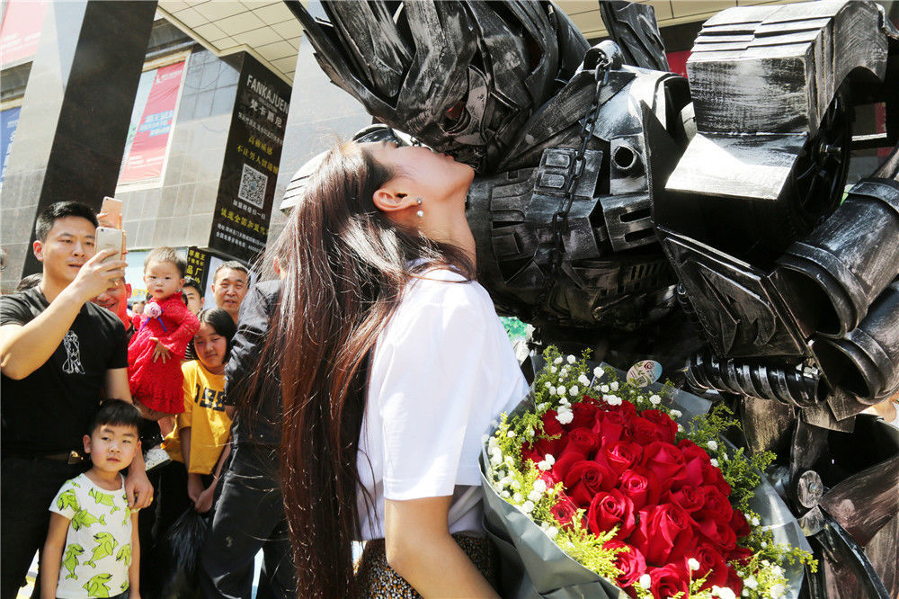 2017年4月29日,河南郑州火车站附近,90后小奎扮成“变形金刚”,向女友缘缘求婚成功,现场数百名路人见证了这一幸福时刻。子君/视觉中国