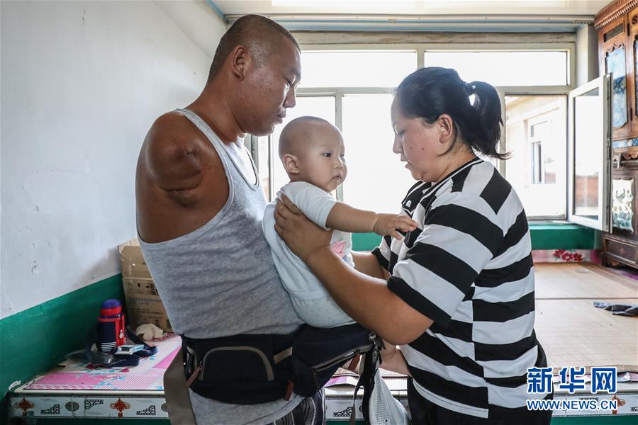 8月8日,爱人何晓曼为王刚戴上婴儿腰凳。新华社记者 潘昱龙 摄