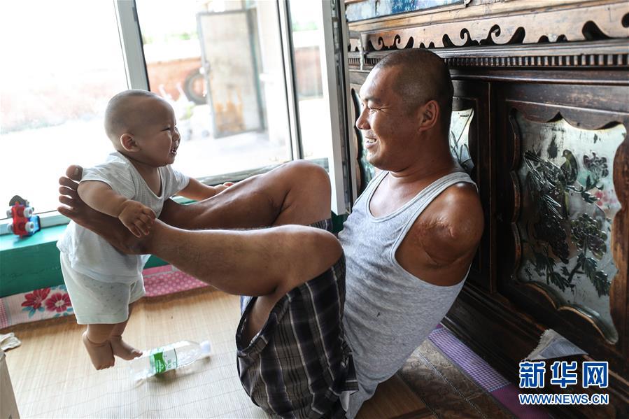 8月8日,王刚与儿子“肉肉”在家中玩耍。新华社记者 潘昱龙 摄