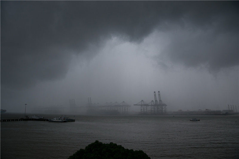 2013年8月13日,强台风“尤特”逼近广东,深圳上空乌云笼罩,白昼如夜。图为深圳盐田港上空被台风的外围云系笼罩。邓飞/视觉中国