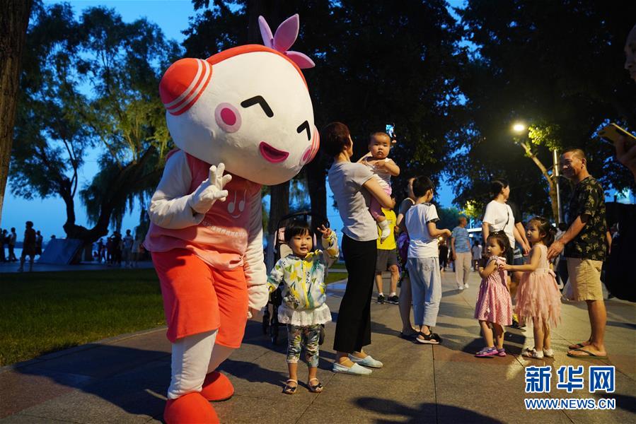 在夜色笼罩的哈尔滨江畔公园,游客与哈尔滨城市旅游吉祥物“滨滨”合影(7月30日摄)。时下,冰城哈尔滨市正值旅游旺季。夜幕下的哈尔滨别有韵味,人们在夜色中感受清爽江风,欣赏欧式建筑,品尝冰城小吃,在清凉惬意中“品味”夜冰城的豪爽与妩媚。 新华社记者王建威摄