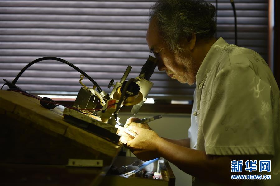 8月8日,在文港镇一家艺术馆内,工艺美术师周信兴在毛笔的笔杆上创作微雕作品。新华社记者 鲁鹏 摄