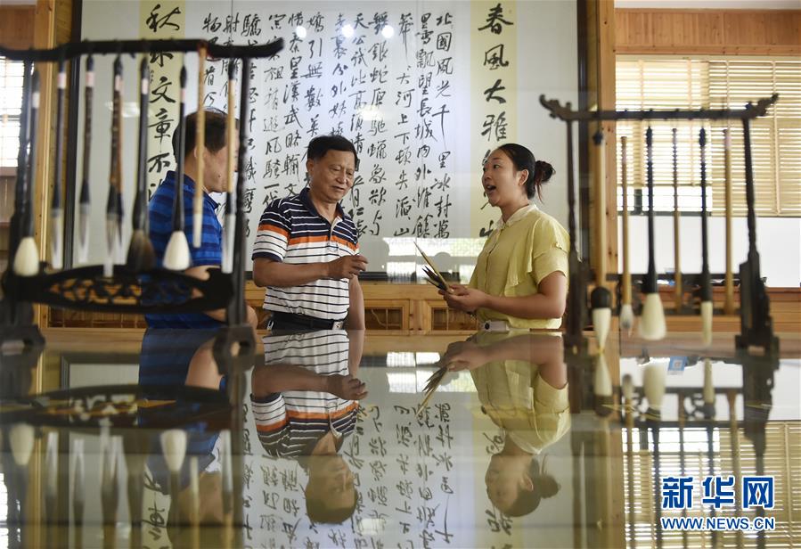 8月8日,文港镇一家笔庄的员工(右)在展厅内向来宾介绍自家制作的毛笔。新华社记者 鲁鹏 摄