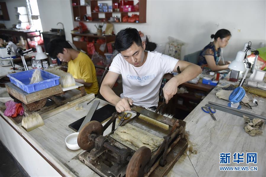 8月8日,文港镇一家制笔企业的员工在车间内制作毛笔。 新华社记者 鲁鹏 摄