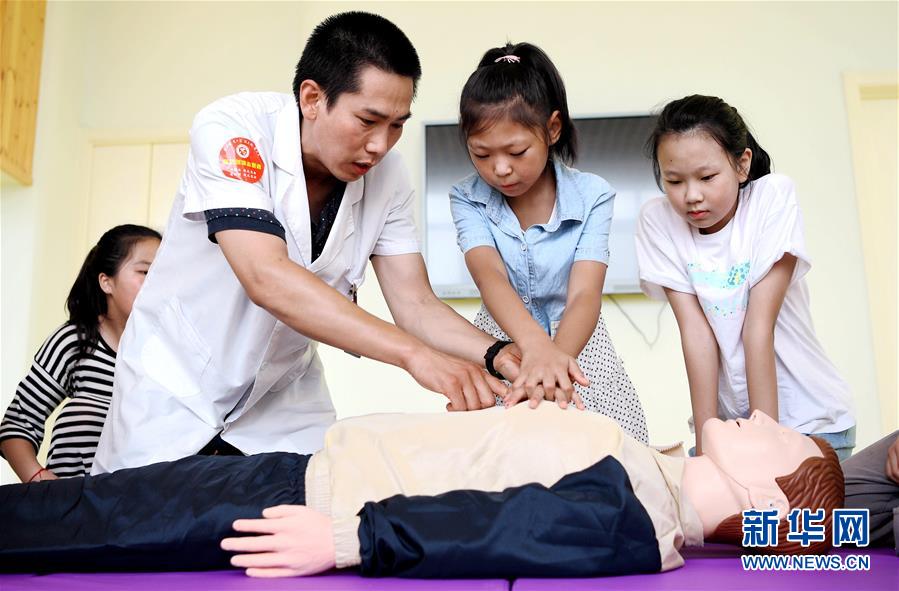 8月9日,在河北省廊坊市安次区银河南路街道嘉多丽社区,医务人员指导孩子们学习心肺复苏急救技能。 暑假期间,河北省廊坊市安次区银河南路街道组织开展“暑假安全伴我行”安全教育活动,组织社区医务人员通过现场授课、模拟演示等形式,教授孩子们心肺复苏急救技能,提高社区孩子们的安全防范意识和应急避险能力,平安度过暑假。 新华社记者 王晓 摄