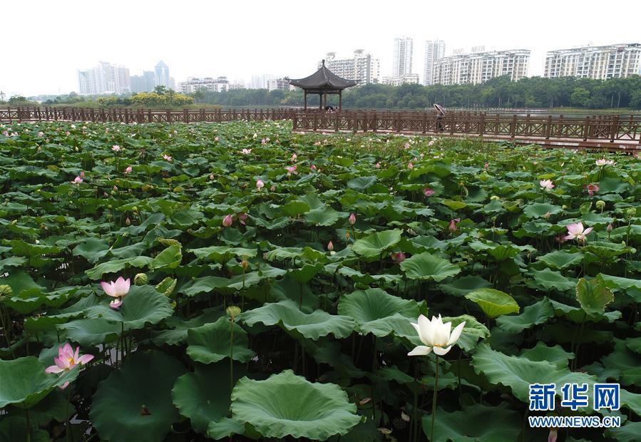 时下,广西南宁市不少地方荷花盛放。娇艳的荷花、碧绿的荷叶,给炎热天气里的人们带来淡淡荷香。