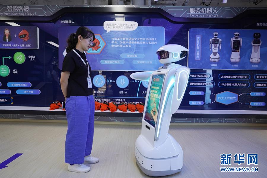 在由天皓成服装批发市场转型的宝蓝金融创新中心,北京慧文科技有限公司的工作人员在演示公司开发的一款服务机器人(8月1日摄)。 新华社记者 鞠焕宗 摄