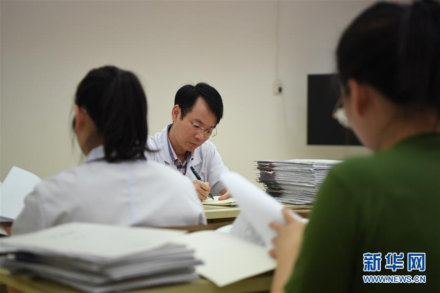 8月6日,中南大学湘雅医院心内科主任余再新教授(中)在病案管理与信息统计中心组织全科各级医生和学生进行出院病历讨论。 新华社记者 薛宇舸 摄