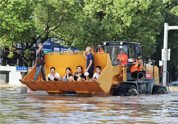 2019年8月11日上午,浙江台州,洪水水位逐渐下降。在各级工作人员救助的同时,临海市民们纷纷开始自救。市民开展自救,清理打扫房子和街道垃圾。孙金标/视觉中国