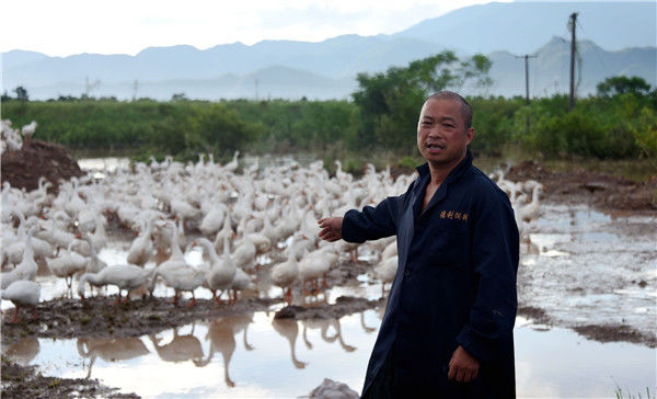 2019年8月11日,浙江台州,养鹅专业户王宏光寻找被台风冲散的鹅。