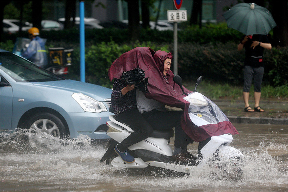 2019年8月10日,江苏无锡。今年第9号台风“利奇马”10日夜间离开浙江后,将进入江苏境内,率先穿越无锡市。受其影响,从10日凌晨开始,无锡全市普降暴雨,局部大暴雨。街头出行的市民在风雨中寸步难行,雨伞都被吹翻。陈中秋/视觉中国