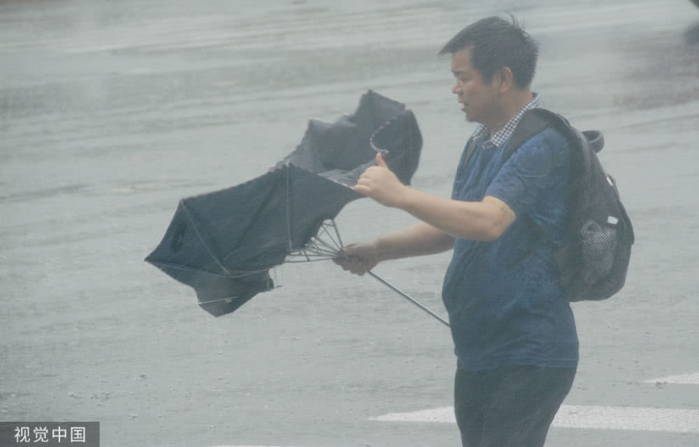 2019年8月10日,江苏无锡。今年第9号台风“利奇马”10日夜间离开浙江后,将进入江苏境内,率先穿越无锡市。受其影响,从10日凌晨开始,无锡全市普降暴雨,局部大暴雨。街头出行的市民在风雨中寸步难行,雨伞都被吹翻。陈中秋/视觉中国