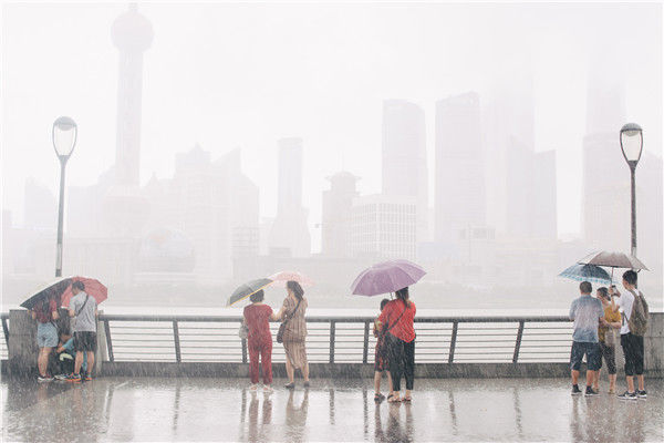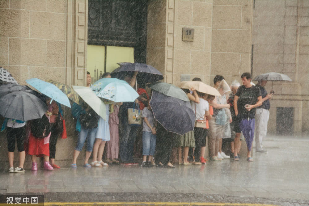 2019年8月10日,台风利奇马凌晨登陆浙江省沿海, 白天给上海带来暴雨影响,路人躲雨穿行。
