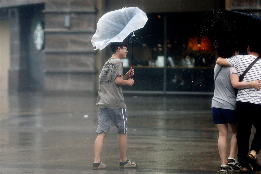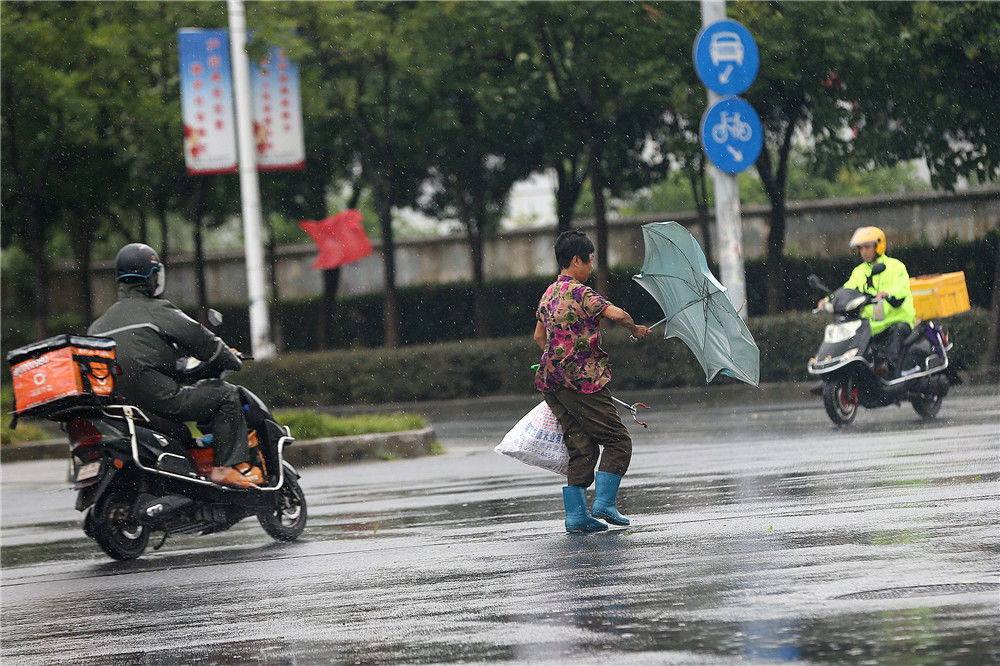 2019年8月9日,浙江金华,随着超强台风 “利奇马”逼近浙江,城市上空乌云密布风雨交加,出行市民措手不及,纷纷在街头奔跑躲避。