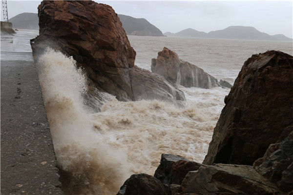 2019年8月9日,浙江舟山,受今年第9号台风“利奇马”影响,朱家尖乌石塘景区掀起大浪,持续不断冲击堤岸。