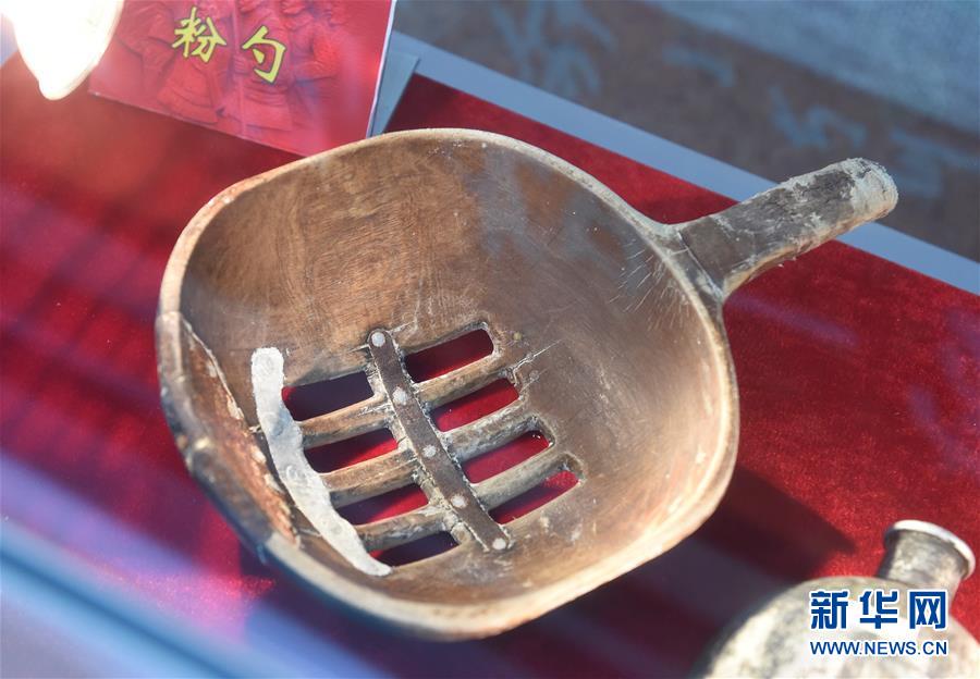 在宁夏西吉县将台堡红军长征纪念园内的三军会师纪念馆里展出的当年红军用过的粉勺(8月11日摄)。新华社记者罗晓光摄