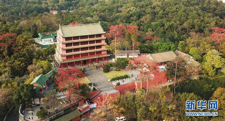 盛开的木棉花和坐落在广州越秀山上的镇海楼交相辉映(2月22日无人机拍摄)。 新华社记者 邓华 摄