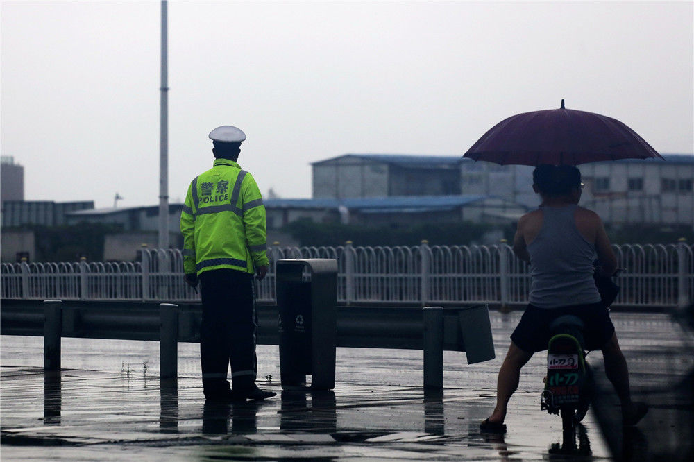 2019年8月11日,在青岛西海岸新区大卢河入海口桥上,一名公安干警正在执勤。王培珂/视觉中国