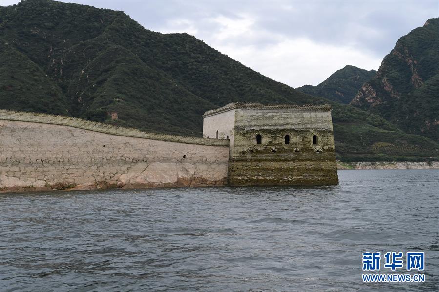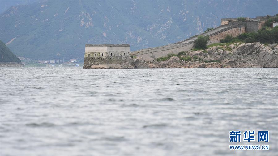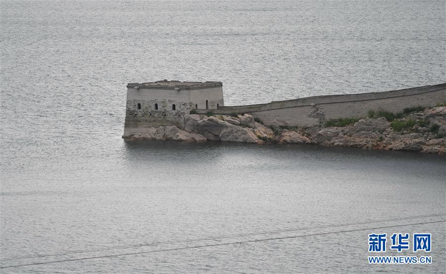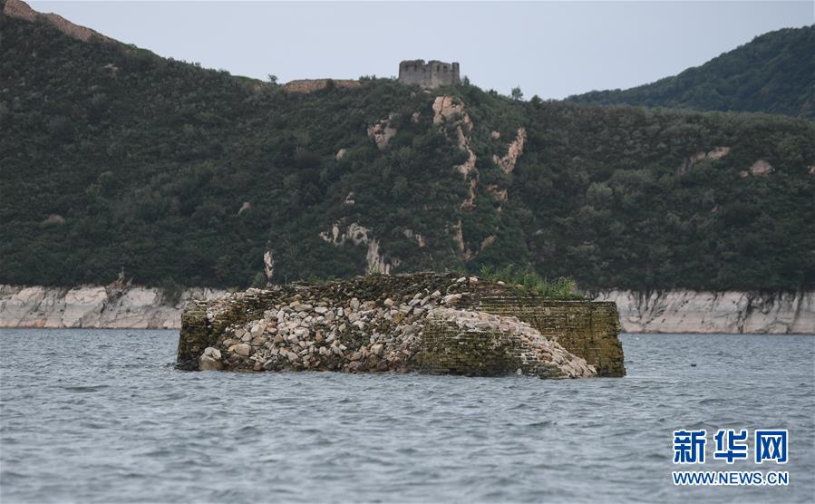 这是露出水面的“水下长城”部分城墙(8月13日摄)。 日前,位于河北省宽城满族自治县境内的潘家口水库蓄水量减少,水库内一段“水下长城”再次露出水面,景色壮美。 这段水下长城是明长城的遗址,20世纪70年代因建设水利枢纽工程,潘家口水库下闸蓄水,部分长城隐没水下,从而形成“水下长城”奇观。 新华社记者 朱旭东 摄