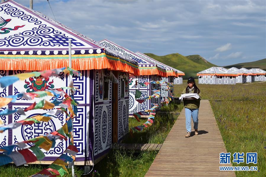 8月13日,工作人员在甘南藏族自治州碌曲县尕海镇尕秀村帐篷城景区内准备整理客房。 新华社记者 马晶 摄