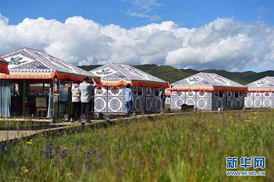 8月13日,游客在甘南藏族自治州碌曲县尕海镇尕秀村帐篷城景区游览。 新华社记者 赵丁喆 摄