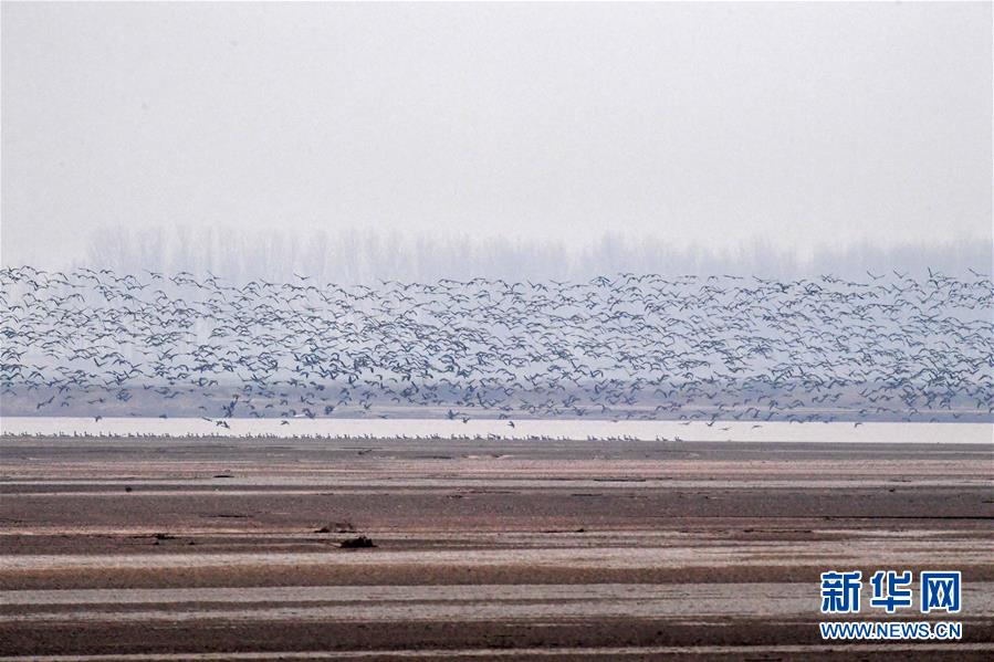 这是2018年12月25日在河南省长垣县境内拍摄的黄河湿地万鸟飞临盛景(无人机拍摄)。新华社记者 冯大鹏 摄