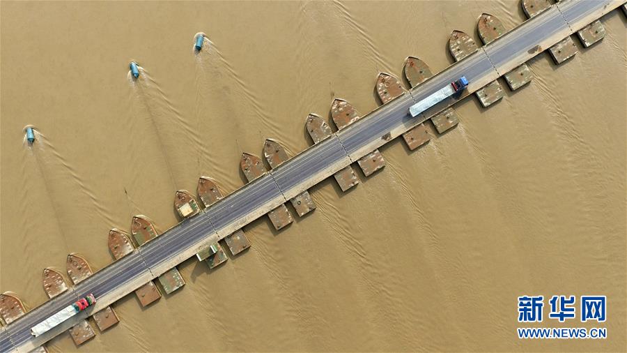 车辆在位于黄河两岸的河南省台前县吴坝镇和山东省东平县银山镇之间的浮桥上行驶(2018年6月26日无人机拍摄)。新华社记者 冯大鹏 摄