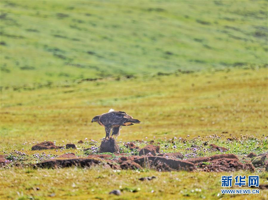 一只大鵟准备享用捕获的猎物(8月14日摄)。 8月12日至14日,来自全国各地的31名自然爱好者聚集在海拔4200米的青海省玉树藏族自治州称多县嘉塘草原,参加“2019嘉塘自然观察节”。自然爱好者用独特视角记录珍稀野生动植物,观察三江源生态。 新华社记者 张大川 摄
