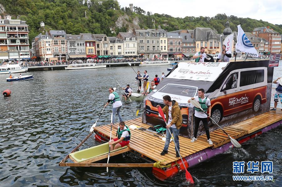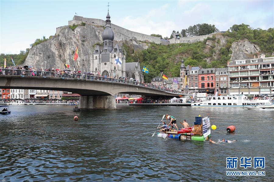 8月15日,在比利时南部小城迪南的默兹河上,人们参加“浴缸划船节”的表演。新华社记者 张铖 摄