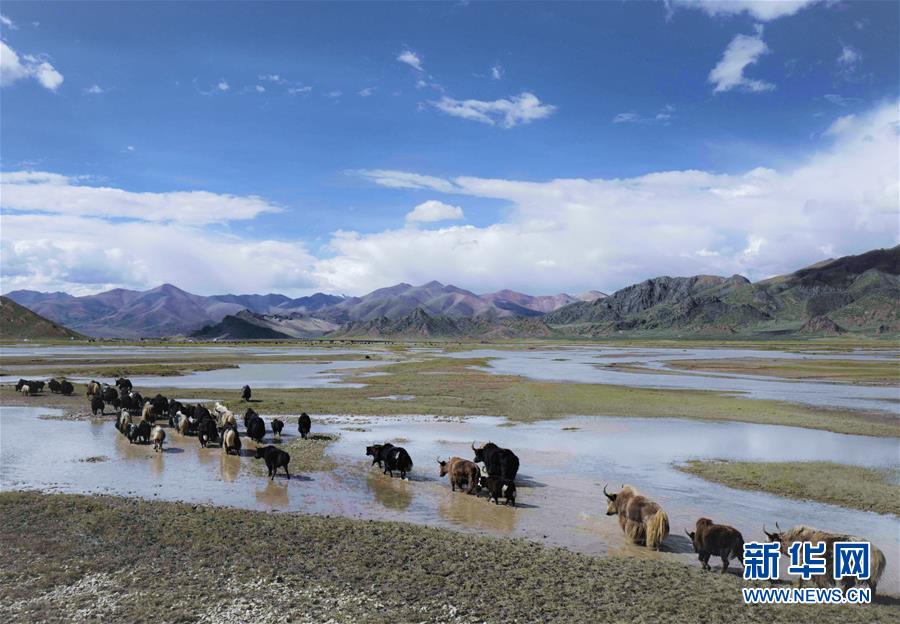 一群牦牛走过藏北湿地(2018年9月7日摄)。新华社记者 普布扎西 摄