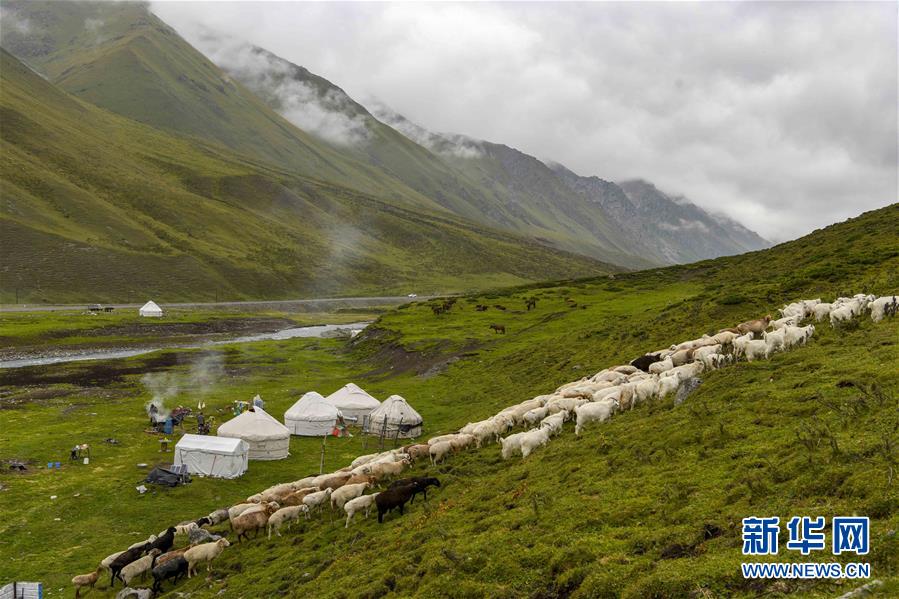 独库公路旁的一处牧场(8月17日摄)。 新疆独库公路为国道217线独山子——库车段,纵贯天山南北,串联冰川、湖泊、森林、草原等多种景观形态,牧民毡房遍布沿线,牛羊散落在高低起伏的草场上,兼具自然与人文之美,成为自驾游客、骑行徒步爱好者在新疆旅游的热门线路之一。 近日,阴雨绵绵,天山山脉被云雾环绕,独库公路展现出不一样的美,令游客流连忘返。 新华社记者 胡虎虎 摄