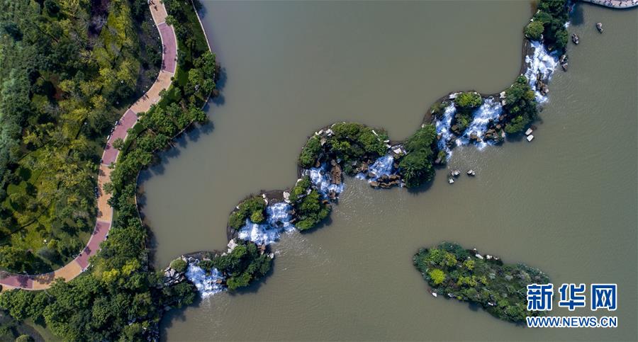 昆明瀑布公园的步行道(8月17日无人机拍摄)。 昆明地处云南中部,是全省政治、经济、文化、教育、科研、社会事业发展中心和交通、通讯枢纽。由于温度、湿度适宜,日照长,霜期短,所以鲜花常年不谢,草木四季常青。 新华社记者 江文耀 摄