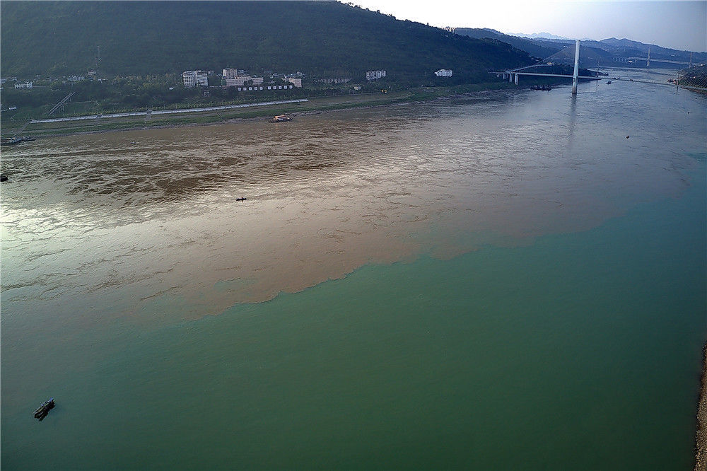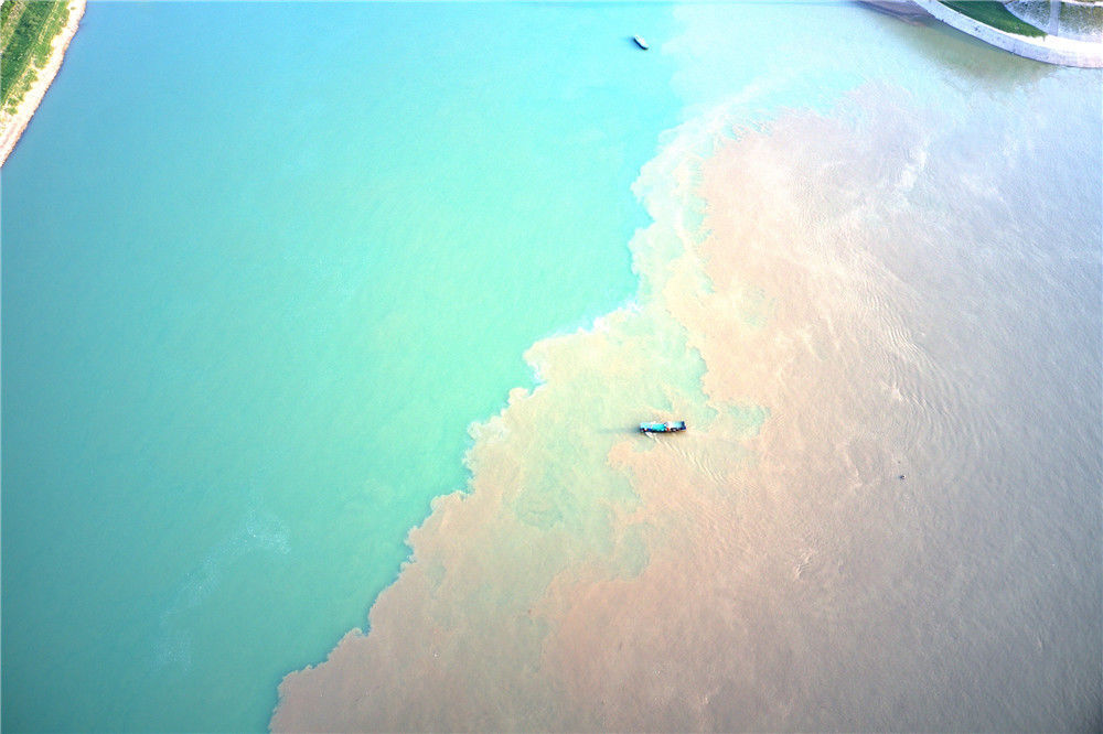 2019年8月17日,重庆涪陵两江广场,长江与乌江两江交汇处出现“鸳鸯锅”自然奇观。