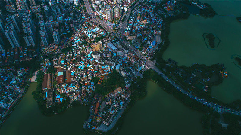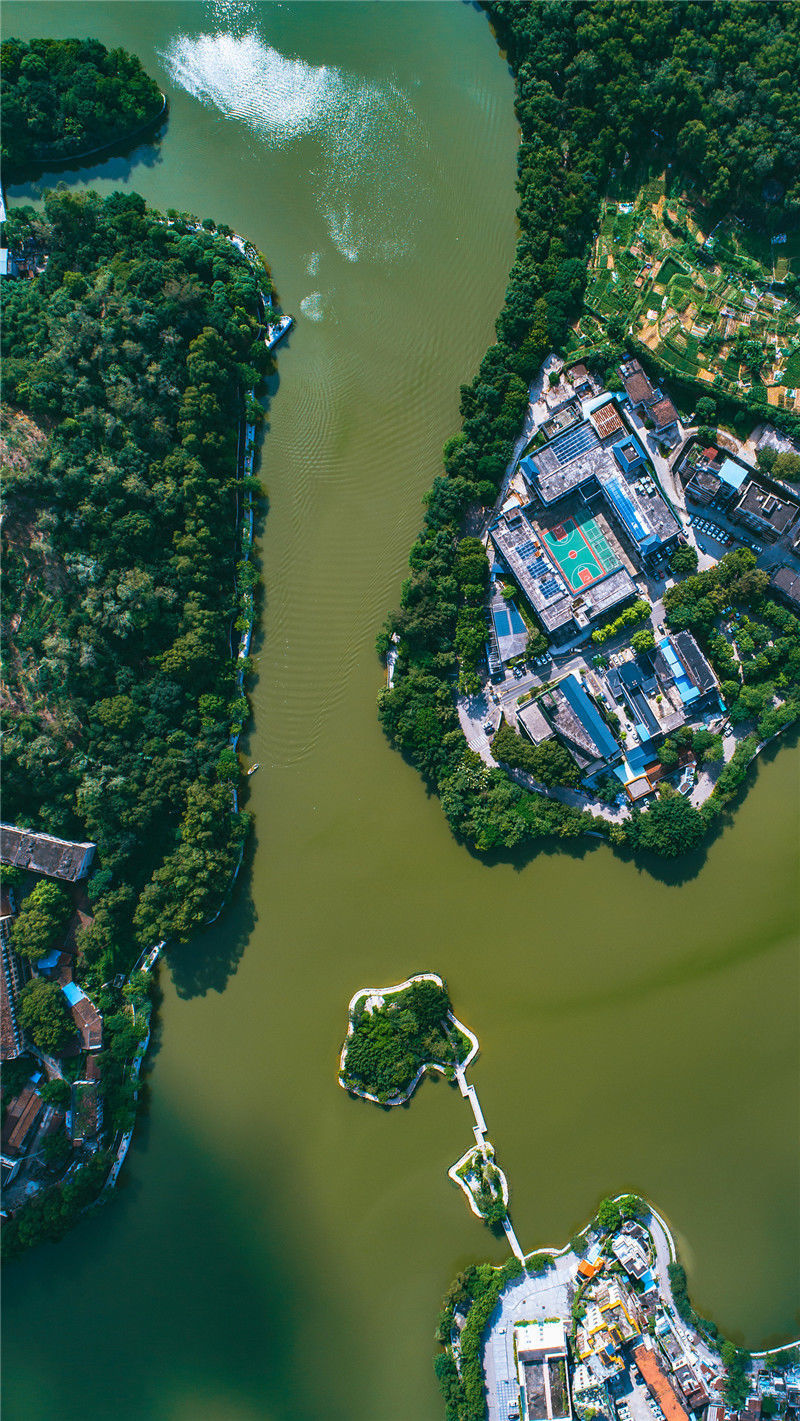 2019年6月14日,广东惠州,受上游暴雨影响,市区东江和西湖水位有所上涨。泛黄的东江水,与青色的西湖水对比明显。
