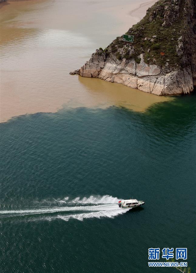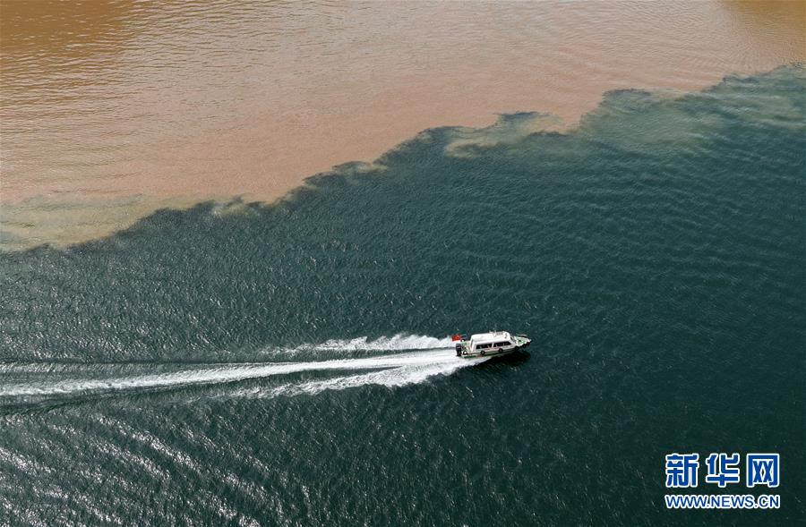 6月2日,在甘肃省临夏回族自治州永靖县刘家峡水库,一艘快艇在洮河和黄河的汇合水域行驶。