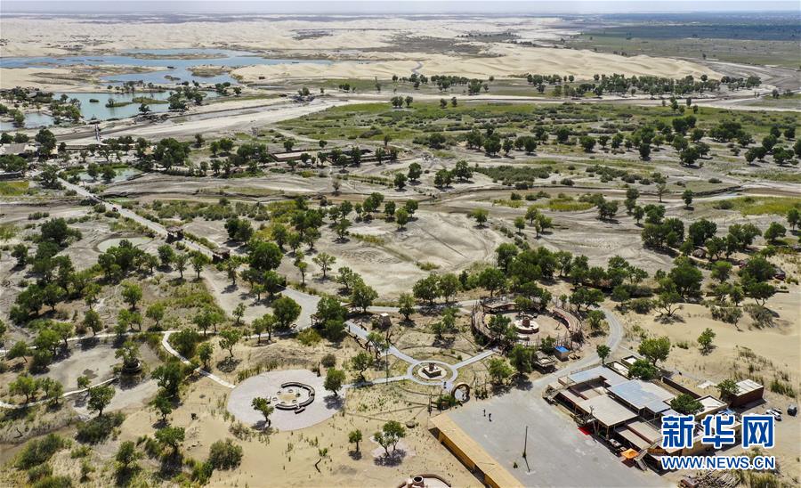 从空中俯瞰位于尉犁县的罗布人村寨(6月19日无人机拍摄)。新华社记者 赵戈 摄