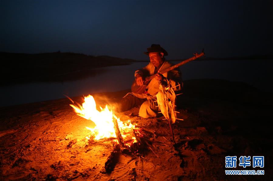 在罗布人村寨,阿木东·艾不东在沙漠里的一处海子旁弹奏乐器,等待烤鱼烤熟(4月11日摄)。新华社记者 赵戈 摄