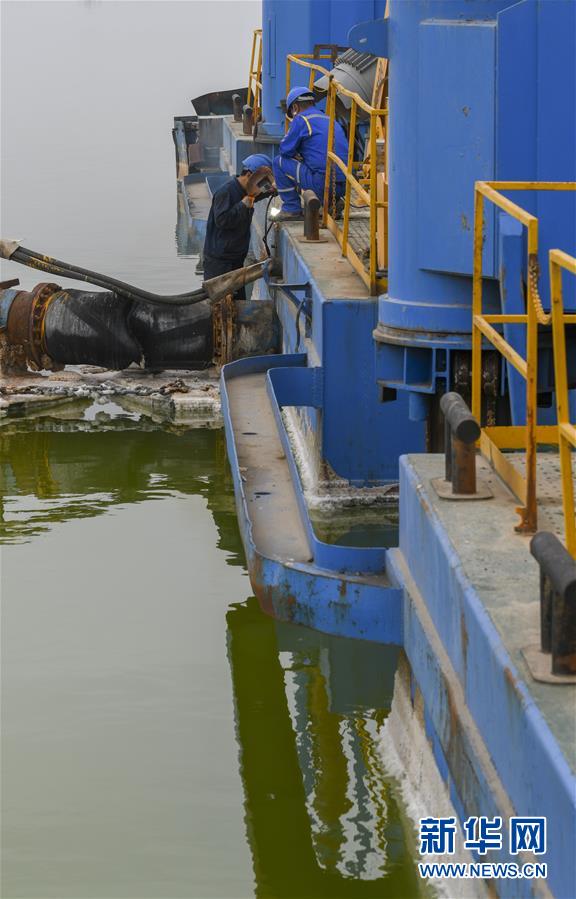 在国投新疆罗布泊钾盐有限责任公司一块盐池里,工作人员在维护采盐设备(8月15日摄)。新华社记者 赵戈 摄