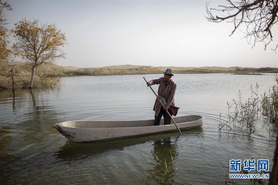 在罗布人村寨,阿木东·艾不东划着卡盆准备去捕鱼(2018年10月16日摄)。新华社记者 赵戈 摄