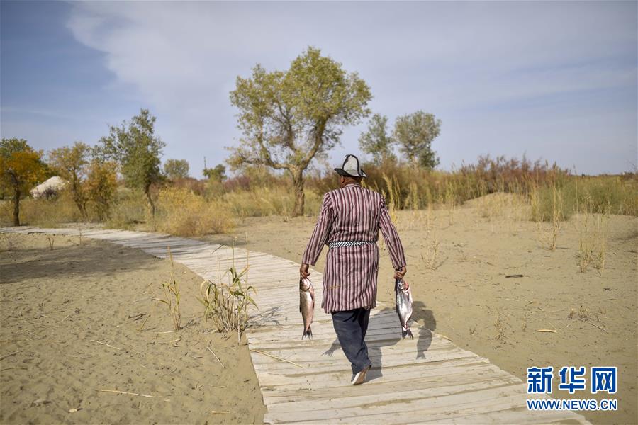在罗布人村寨,阿木东·艾不东拎着两条洗好的鱼准备制作罗布烤鱼(2018年10月16日摄)。新华社记者 赵戈 摄