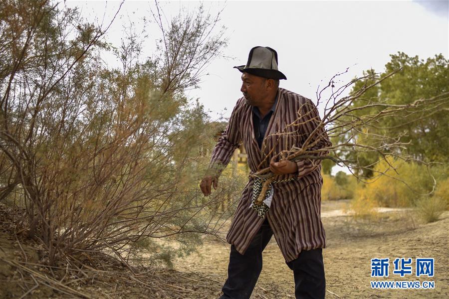 在罗布人村寨,阿木东·艾不东在准备用于制作罗布烤鱼的红柳(2018年10月16日摄)。新华社记者 赵戈 摄