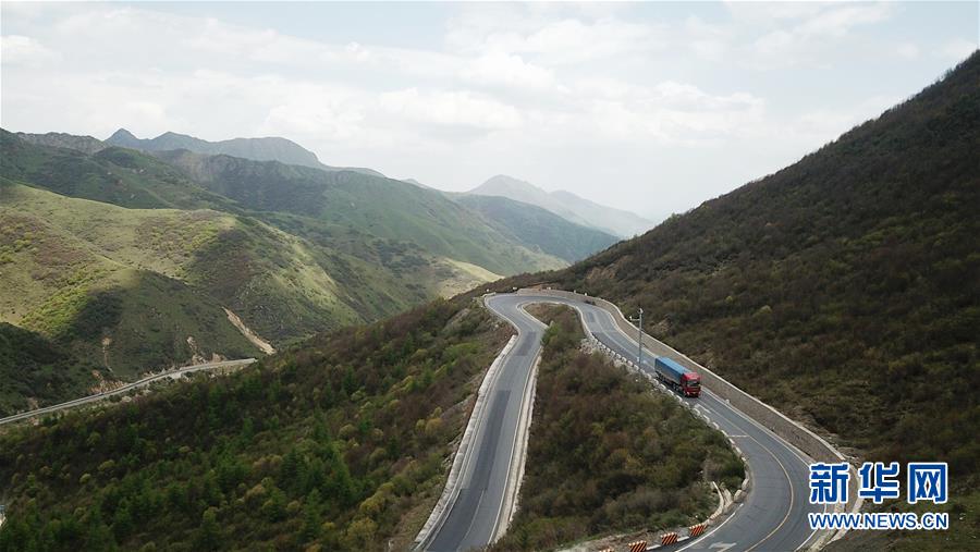 货车行驶在分水岭国道212线上(5月21日无人机拍摄)。 新华社记者 陈斌 摄