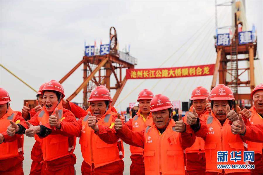 4月2日,工人庆祝池州长江公路大桥顺利合龙。 新华社记者曹力摄