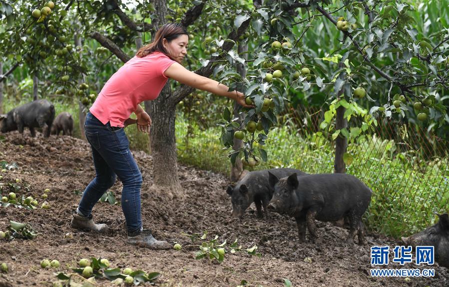 8月20日,康丹丹在果园内摘果树上的苹果梨喂猪。新华社记者 王昊飞 摄