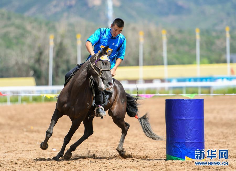 8月20日,骑手在“蒙古马”传统技巧表演中展示骑马绕桶。 新华社记者 彭源 摄