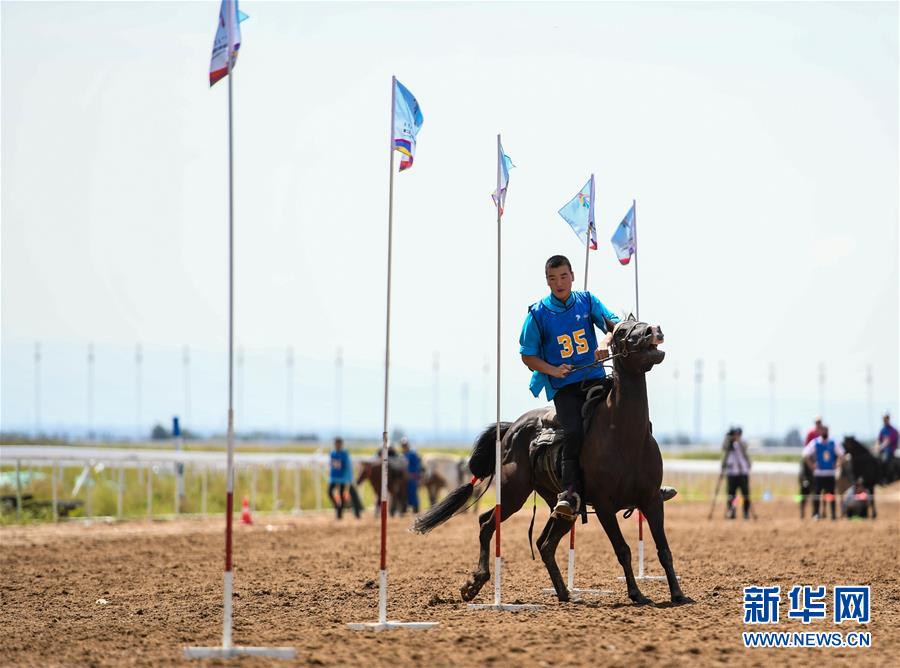 8月20日,骑手在“蒙古马”传统技巧表演中展示骑马穿桩。 新华社记者 彭源 摄